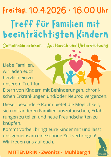 Dieser besondere Raum bietet Eltern von Kindern mit Behinderungen, chronischen Erkrankungen und/oder Neurodivergenzen die Möglichkeit, mit anderen Familien Erfahrungen zu teilen und neue Freundschaften zu knüpfen. Kommt vorbei, bringt eure Kinder mit und lasst uns gemeinsam eine schöne Zeit verbringen!